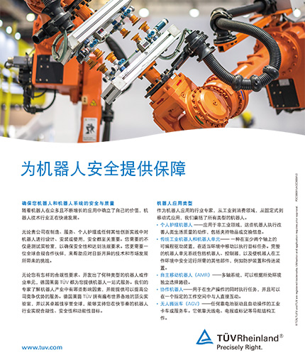 德国莱茵TÜV正是您所寻求的合作伙伴。无论您具有怎样的合规性要求、开发出了何种类型的机器人或机器人作业单元,德国莱茵TÜV都为您提供了一站式服务,随时准备好助推您进入全球市场。