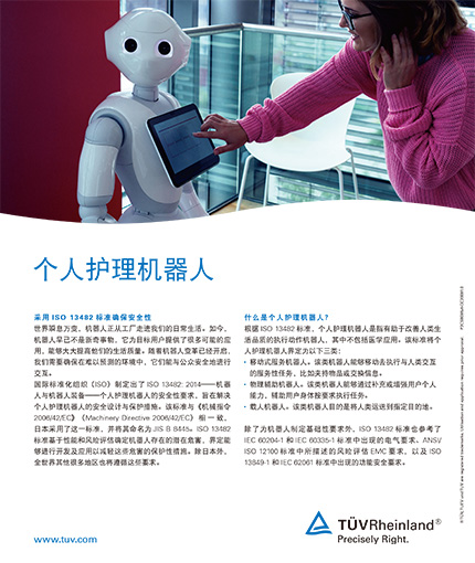 个人护理机器人是指有助于改善人类生活品质的执行动作机器人(不包括医学应用)。移动式仆从机器人能够通过移动来执行任务,包括夹持物品或交换信息。由于这些机器人用于非工业领域,将会由未经培训的人员使用它们,因此安全性至关重要。