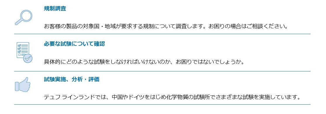 テュフラインランドでは、お客様の製品が規制に対応していることを確実にするため、仕向け地の規制調査や必要な分析・試験をお手伝いします。